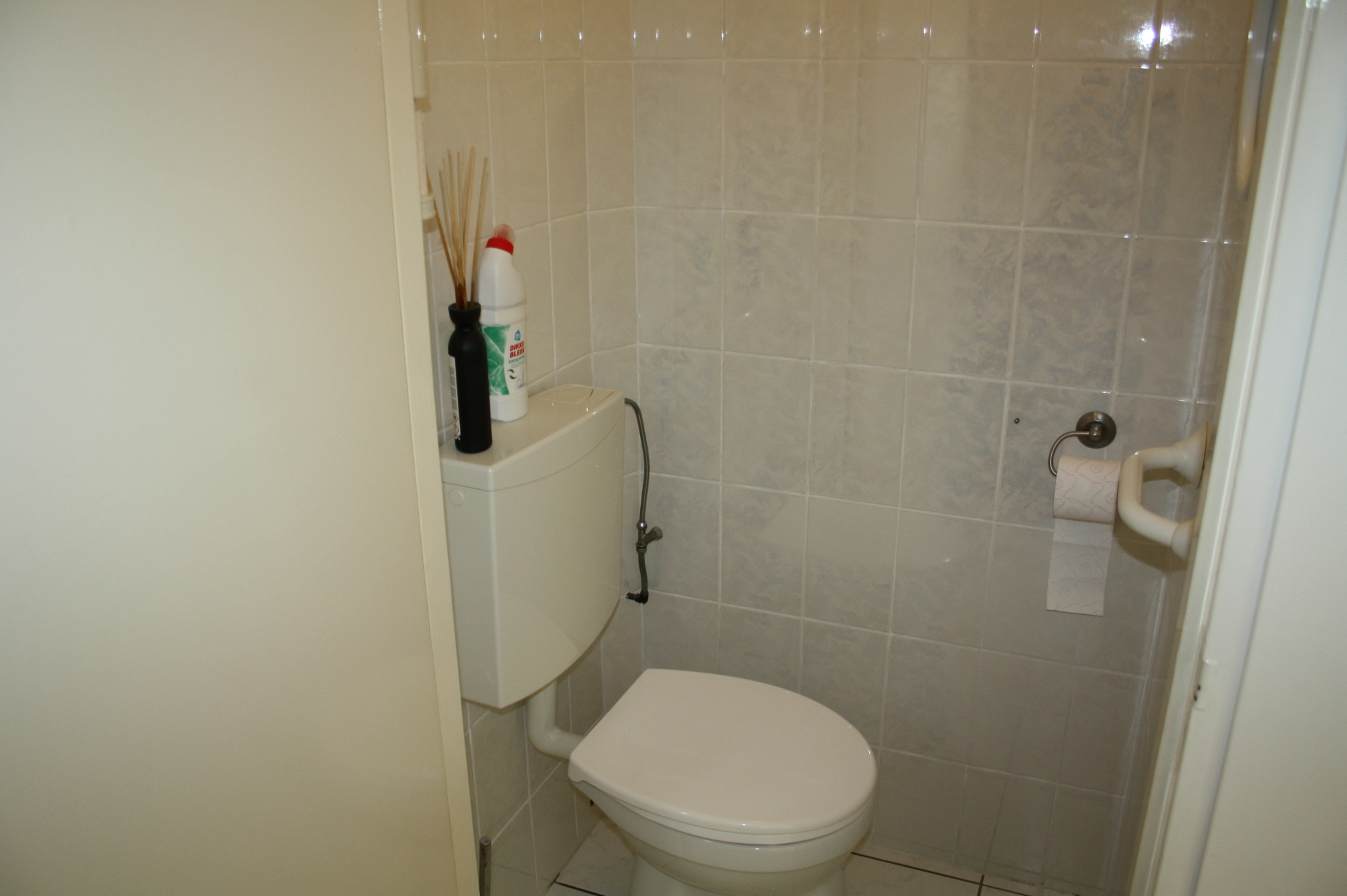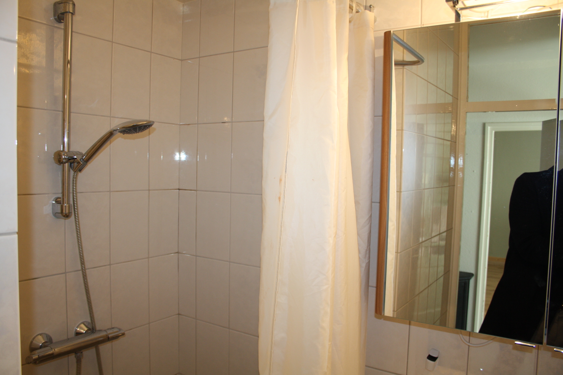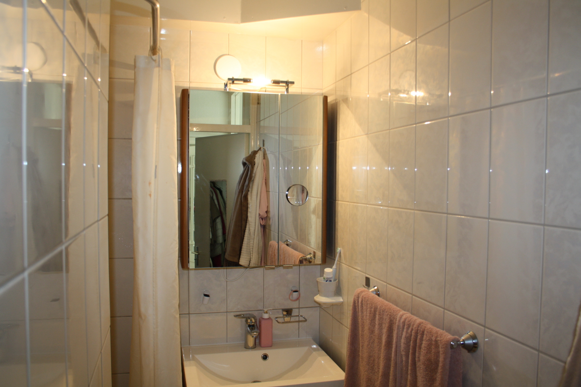 Geheel betegelde badkamer (2.40m2) met douche, badmeubel met wastafel.