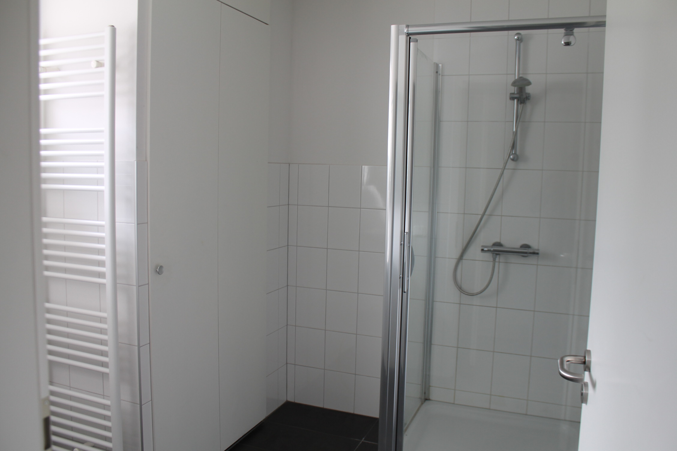 Geheel betegelde en moderne badkamer (2.53 x 2.44) v.v. douchecabine, wastafel, designradiator en weggewerkte wasmachine- en drogeraansluiting.