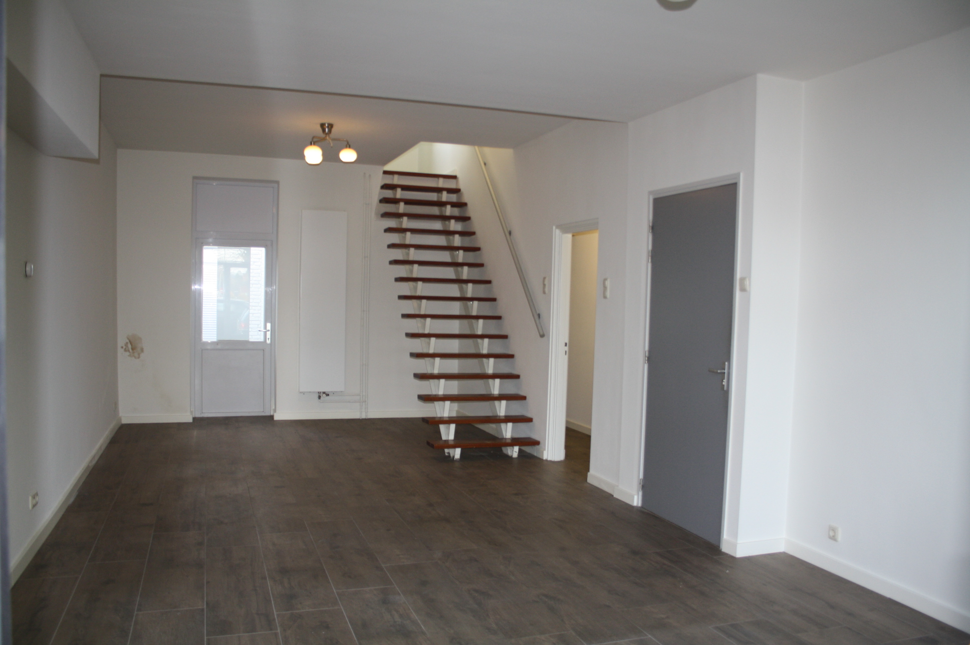 Gemeenschappelijke hal/entree. Ruime woonkamer (8.55 x 4.08) met tegelvloer in hout "look" en deur naar patiotuin. Hal naar gesloten leefkeuken (4.34 x 3.20). De keuken is voorzien van een moderne aanbouwkeuken met wasmachineaansluiting en apparatuur (oven, 4-pitsgaskookplaat, afzuigkap). Halfhoog betegeld toilet met fonteintje. Vanuit de keuken is tevens de patiotuin bereikbaar.