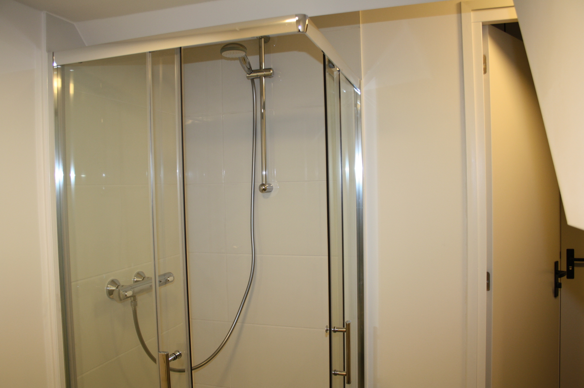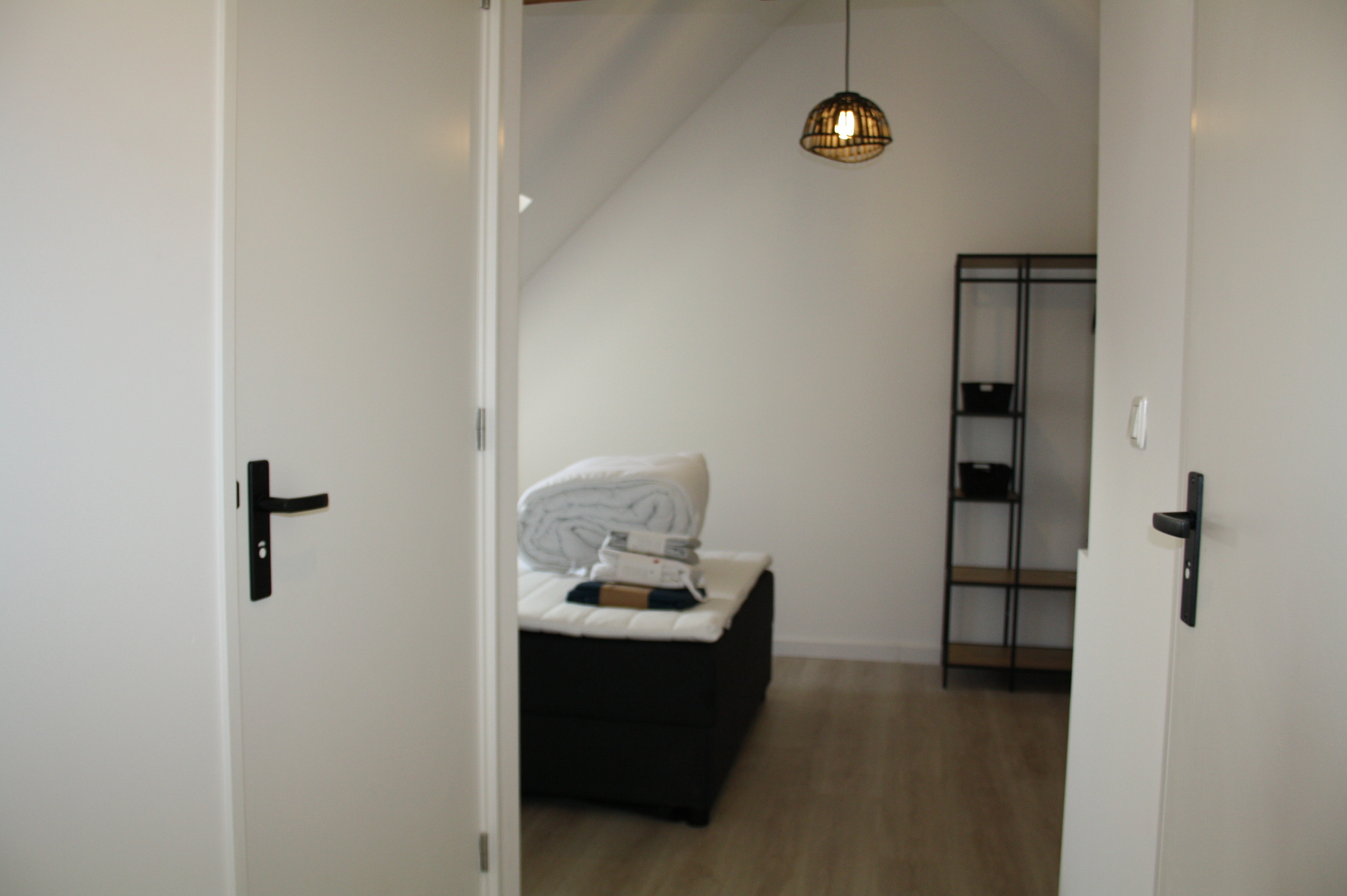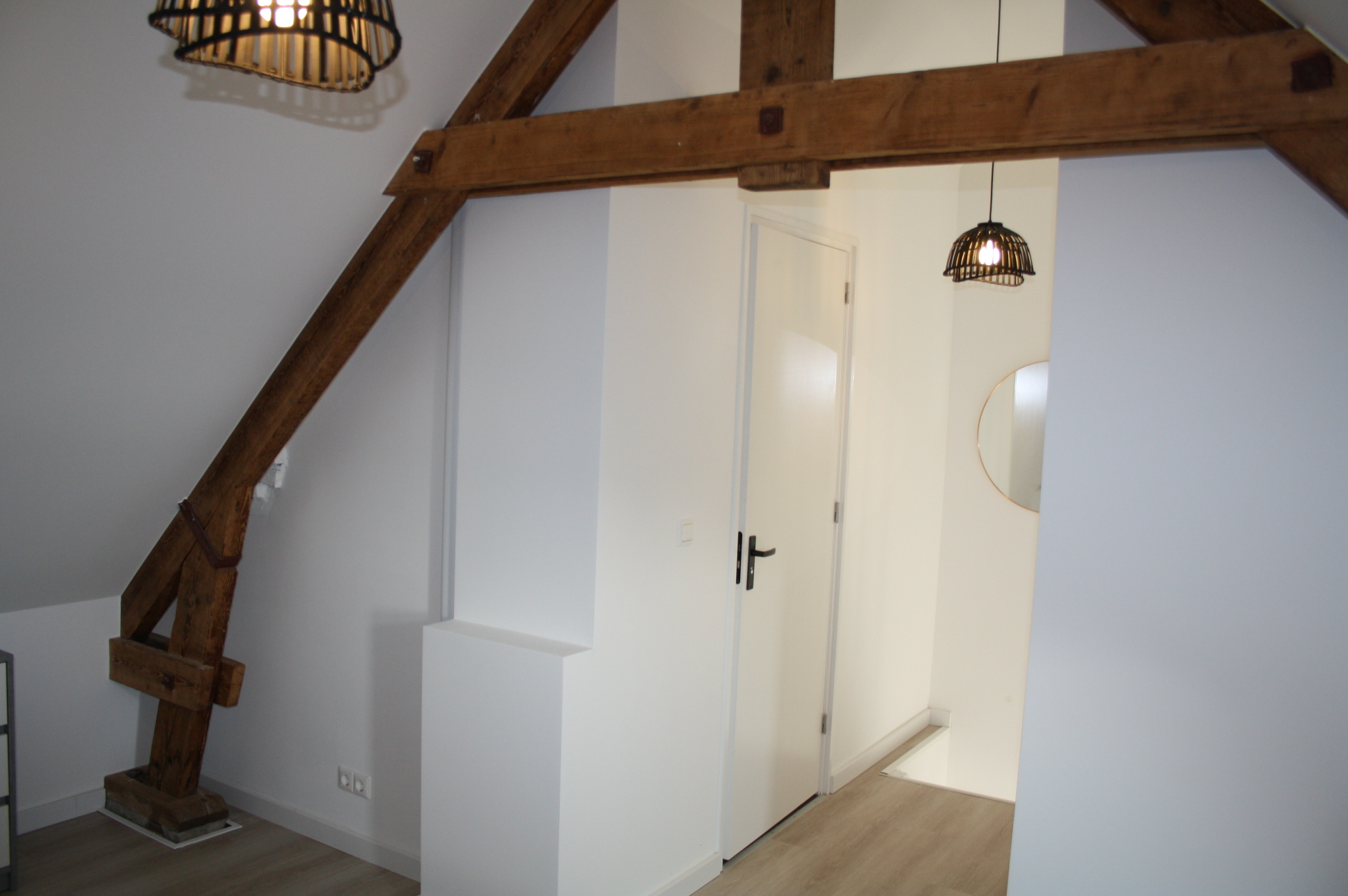 Slaapkamer (2.59 x 4.65) met oude spanten en toegang tot de moderne badkamer (circa 2.21 x 2.31) met douche voorzien van douchecabine, wastafel met badmeubel, wasmachine aansluiting. Separaat toilet (1.38 x 1.45).