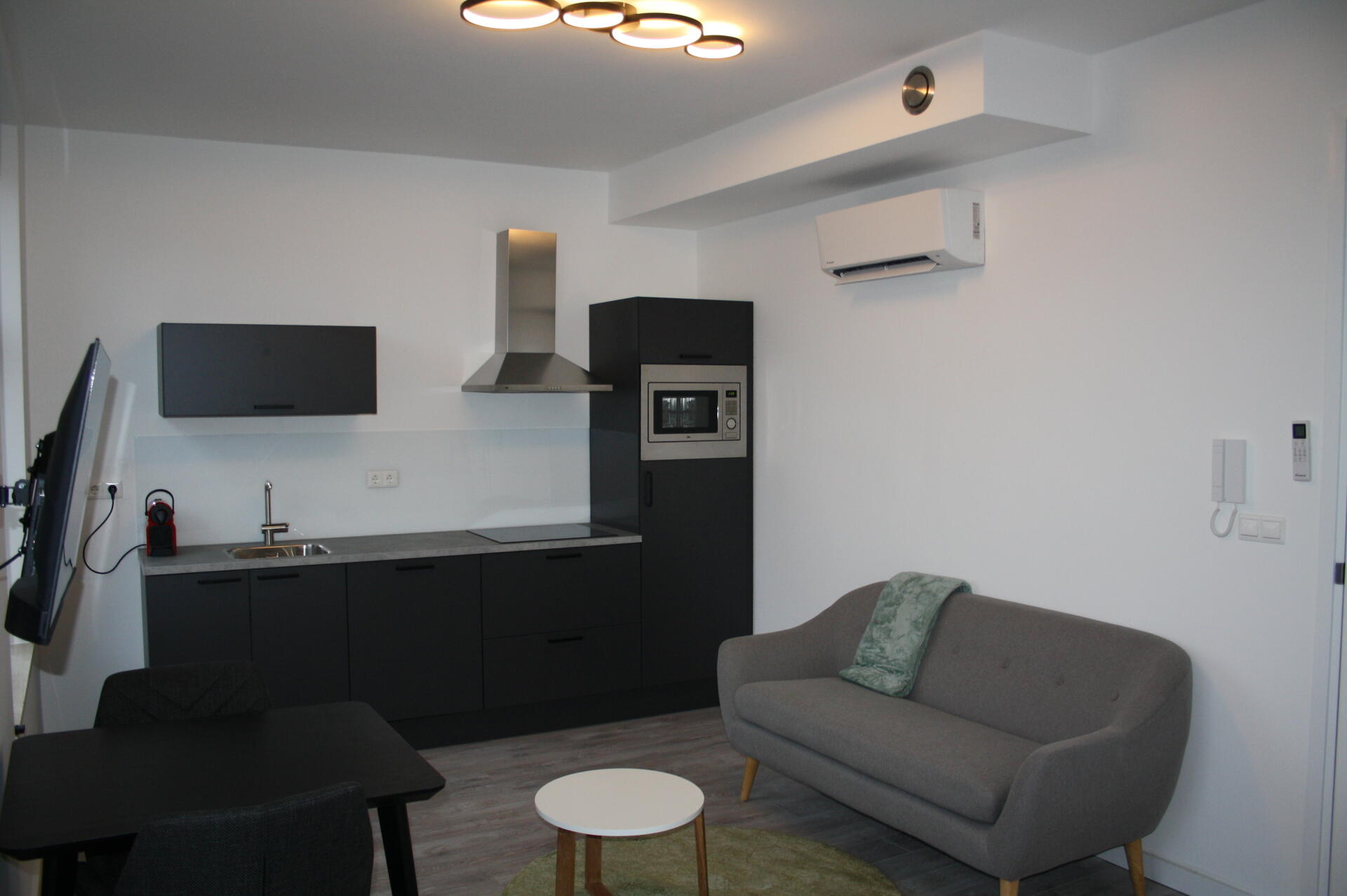 Woonkamer met open keuken totaal ( 5.66 x 3.28). De keuken is voorzien van een moderne keuken met apparatuur (koelkast met vriesvak, vaatwasser, oven, koelkast, afzuigkap, inductie kookplaat).
