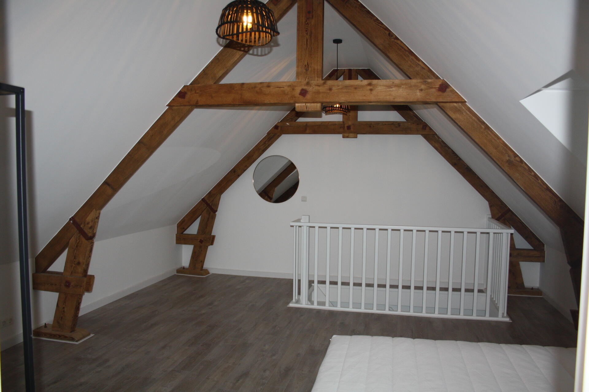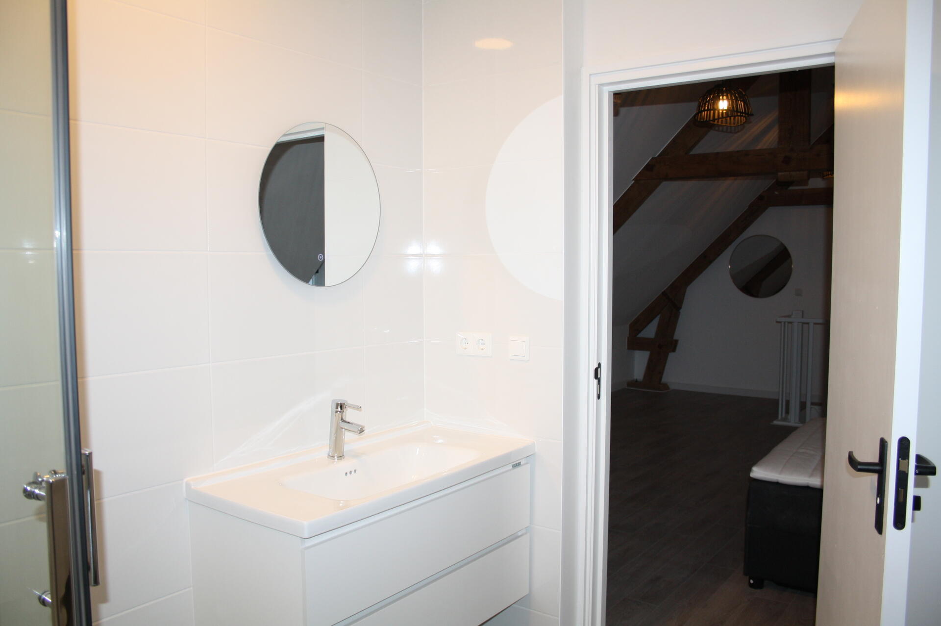 Slaapkamer (4.15x 6.30) met oude spanten en toegang tot de moderne badkamer (circa 2.42 x 2.50) met douche voorzien van douchecabine, wastafel met badmeubel, toilet en wasmachine aansluiting.