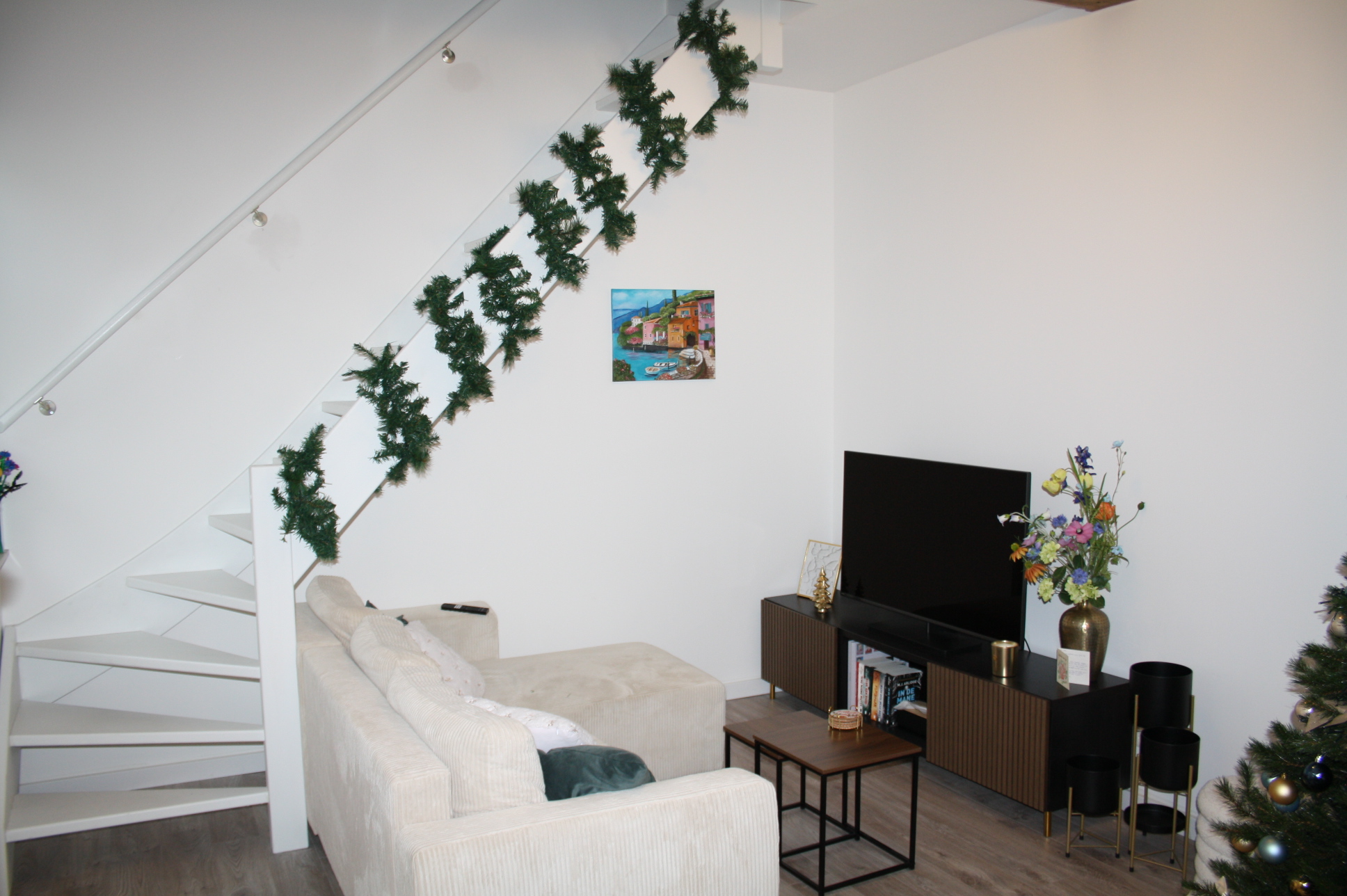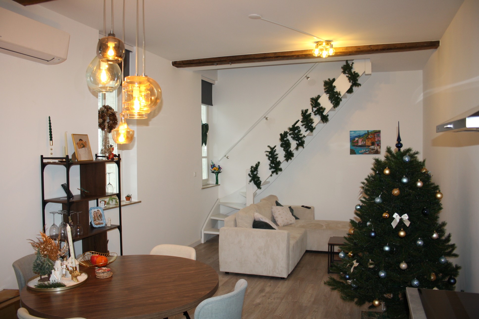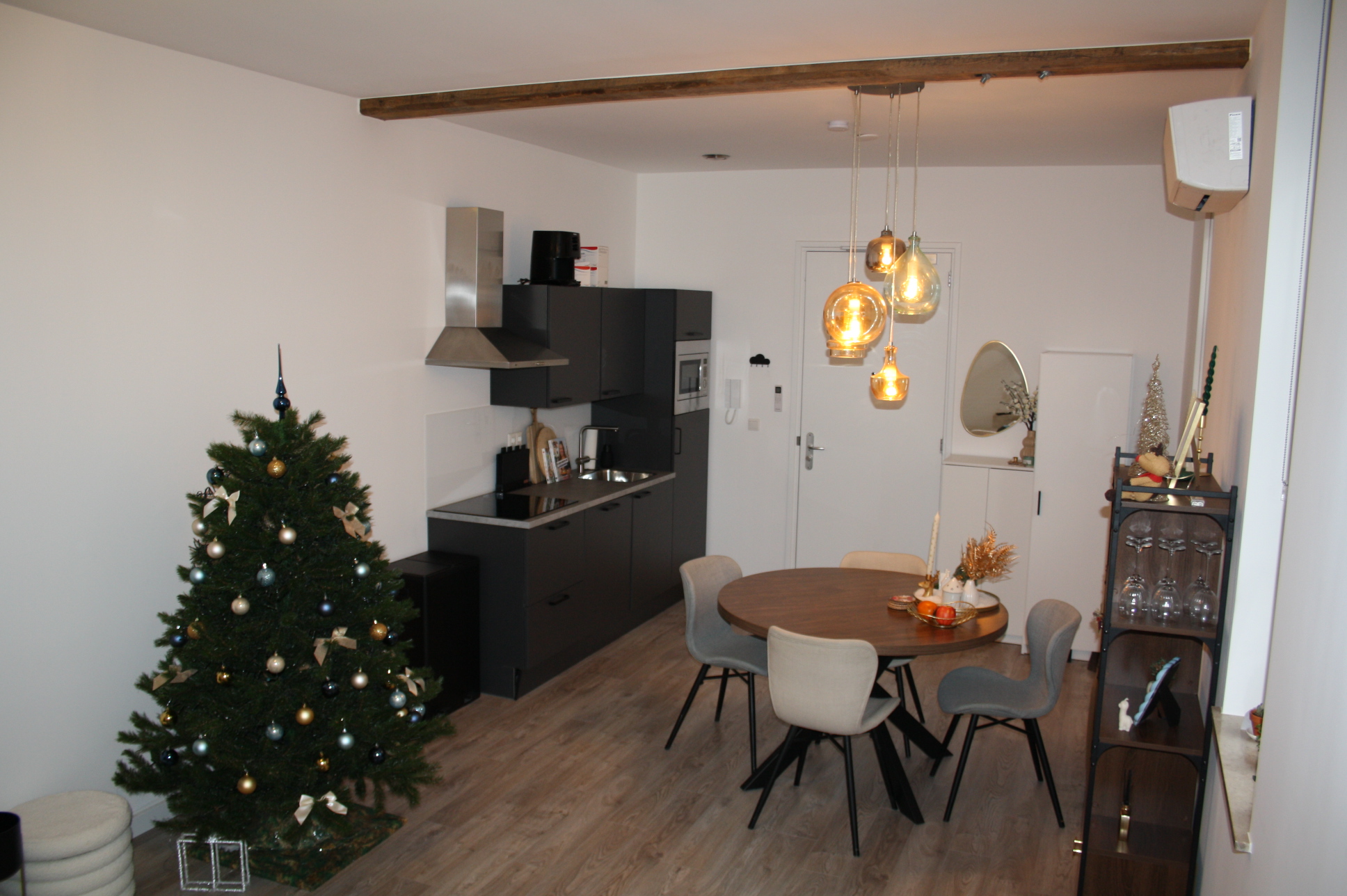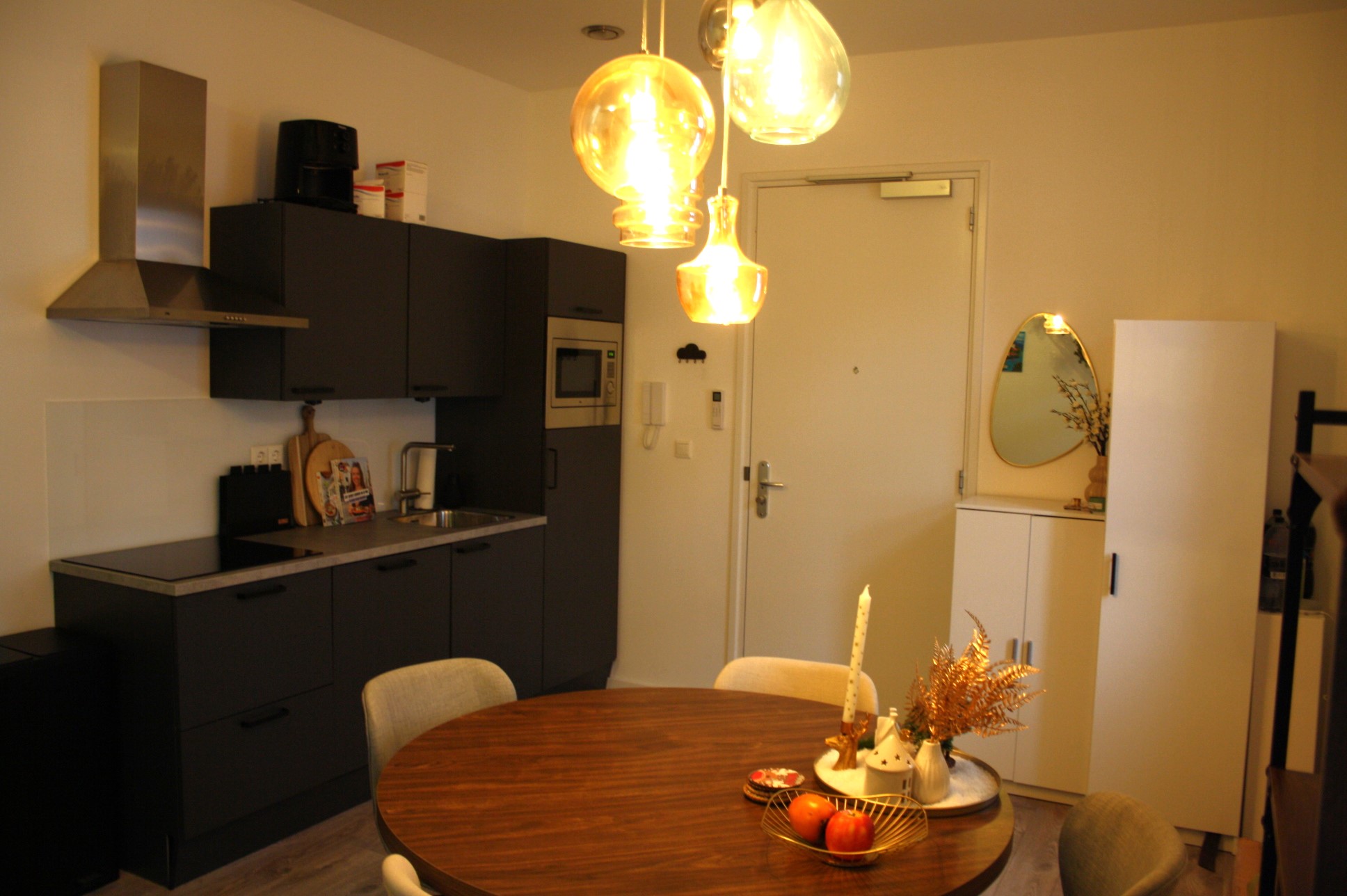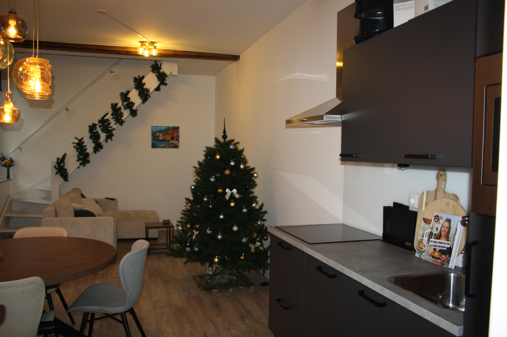 Woonkamer met open keuken totaal (7.36 x 3.55). De keuken is voorzien van een moderne keuken met apparatuur (koelkast met vriesvak, vaatwasser, oven, koelkast, afzuigkap, inductie kookplaat).