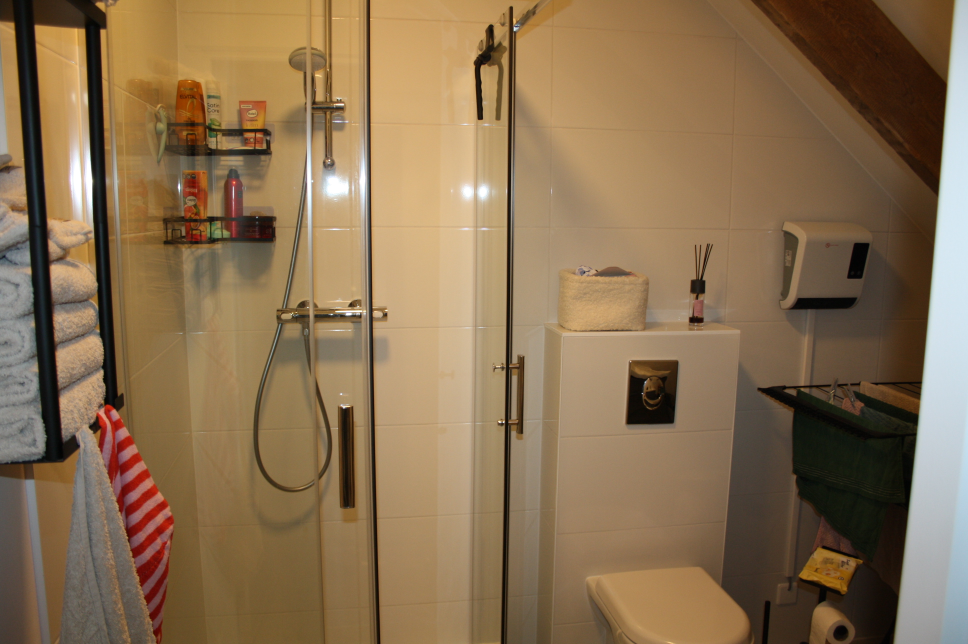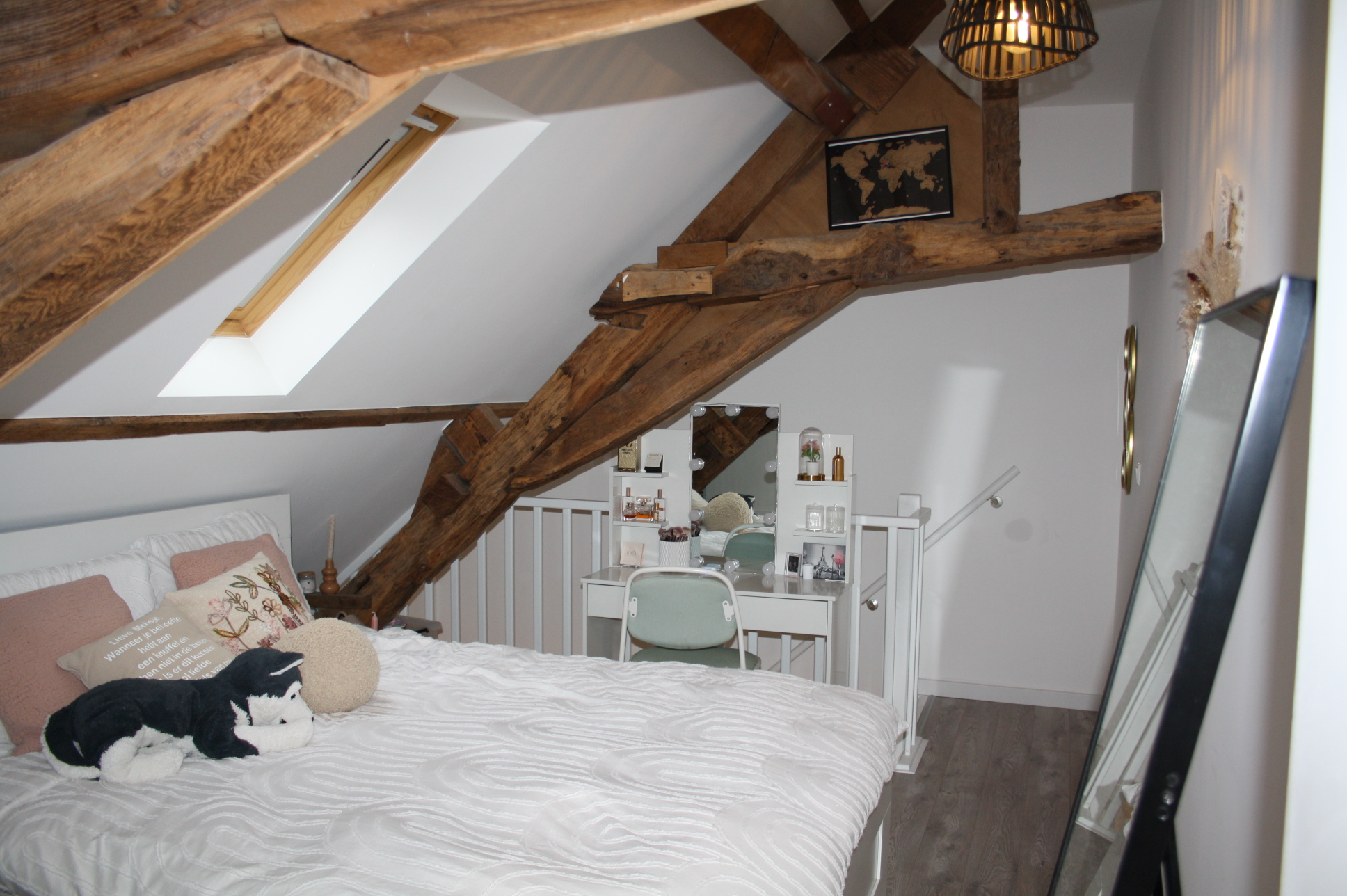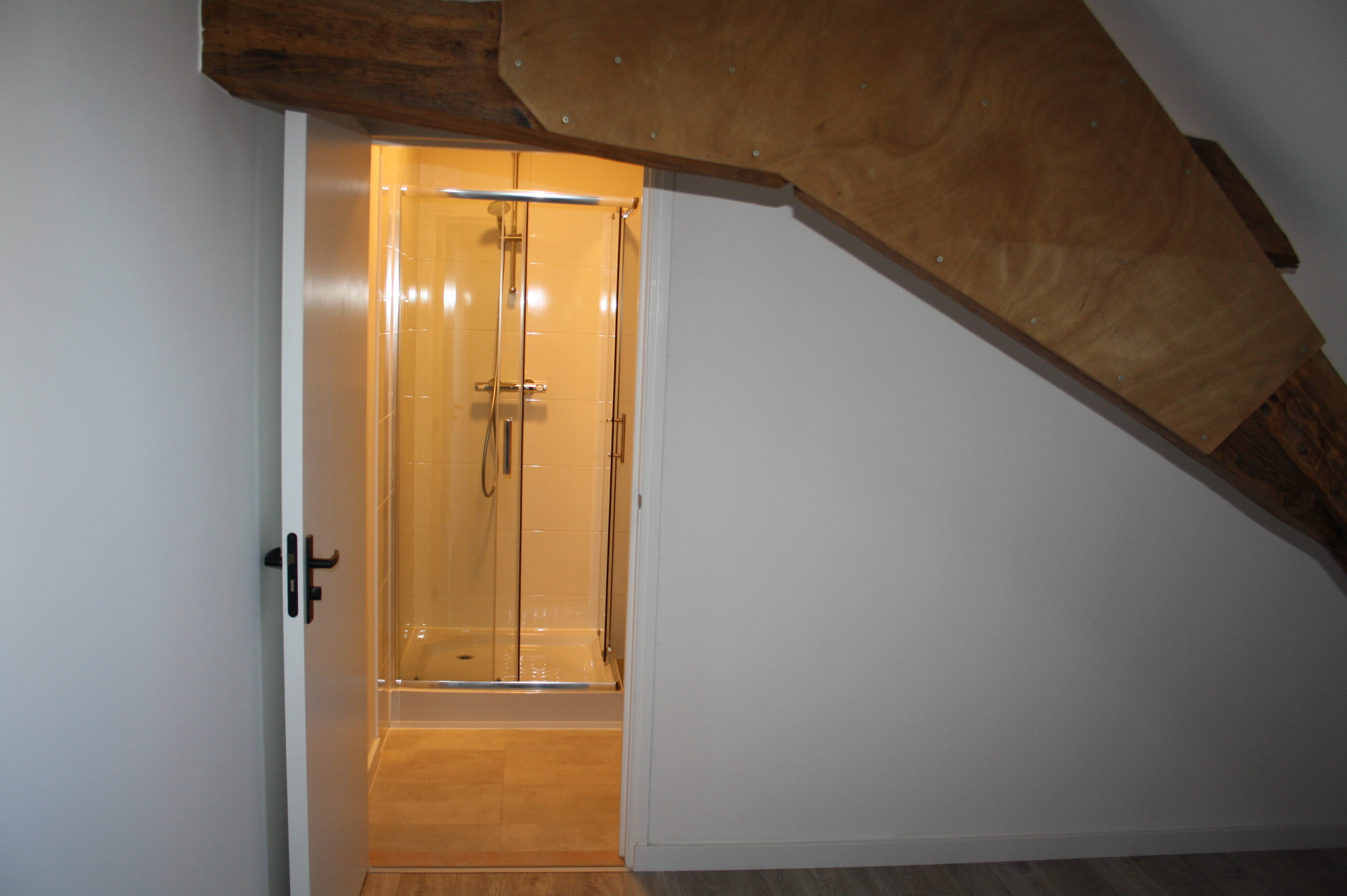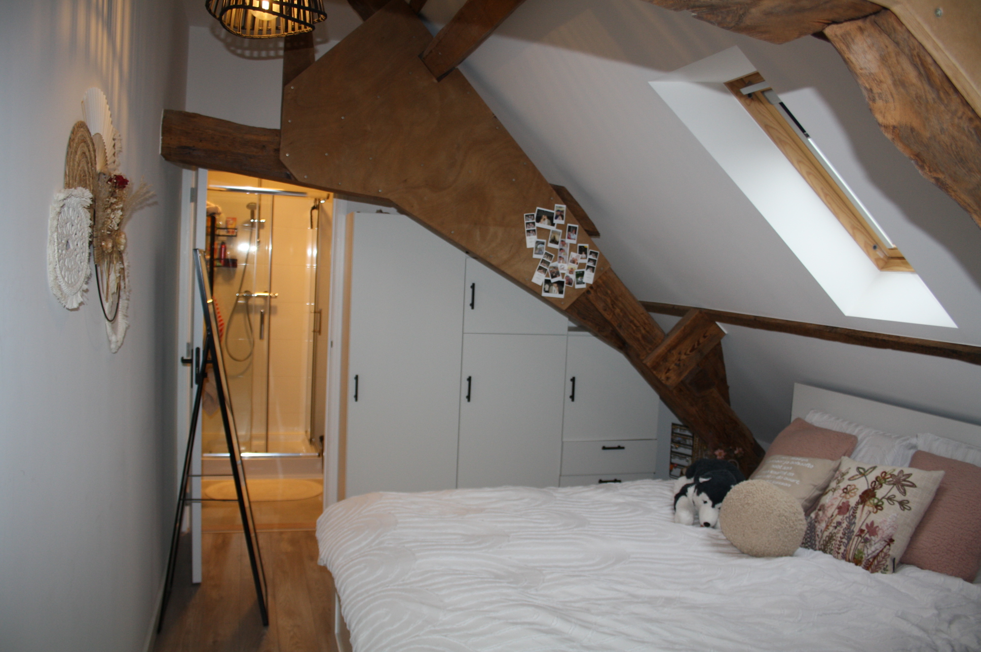 Slaapkamer (4.43 x 3.14) met oude spanten en toegang tot de modern (circa 1.95 x 2.70) met douche voorzien van douchecabine, wastafel met badmeubel, wasmachine aansluiting en toilet.