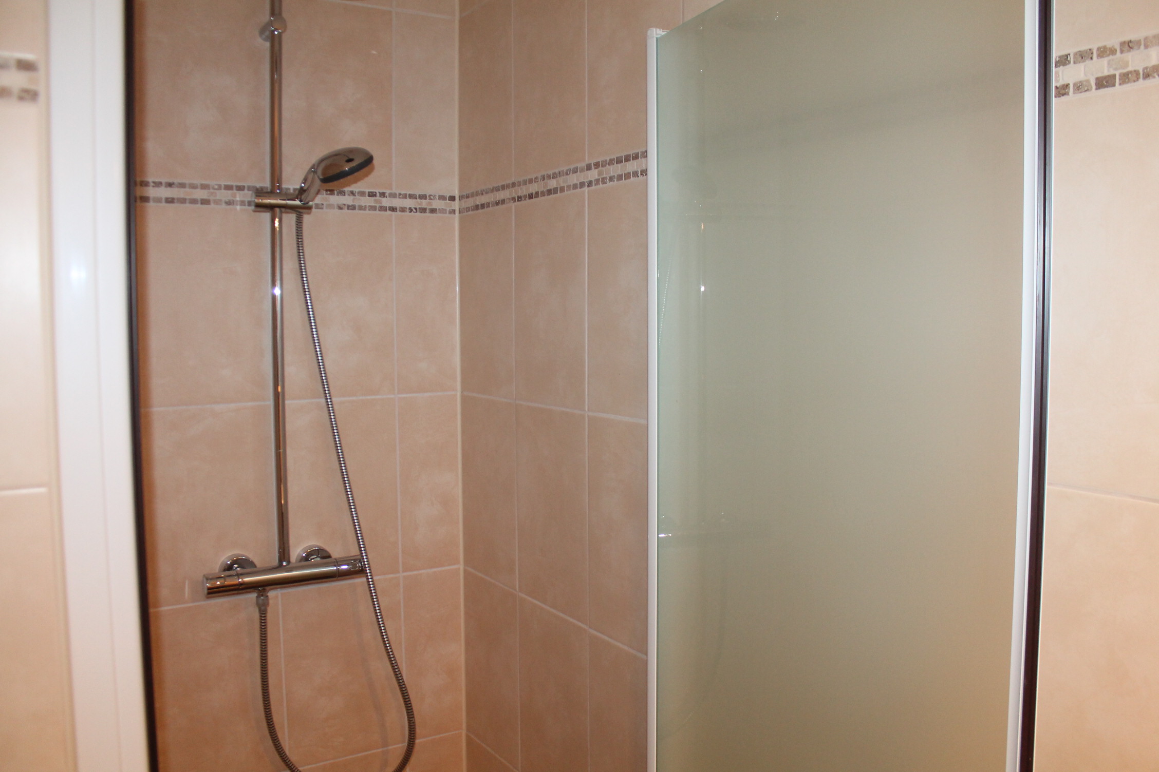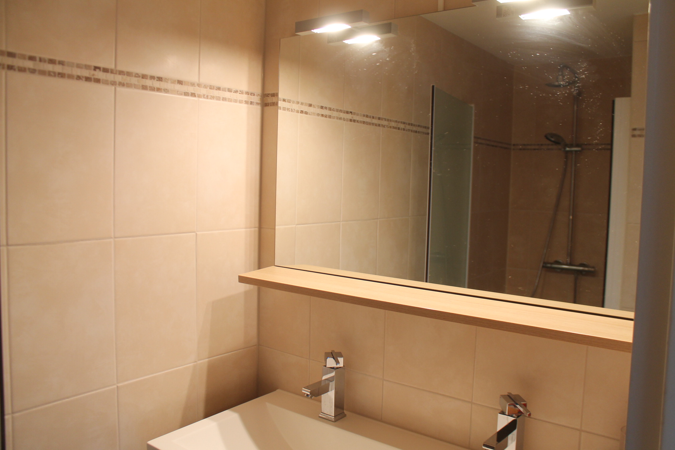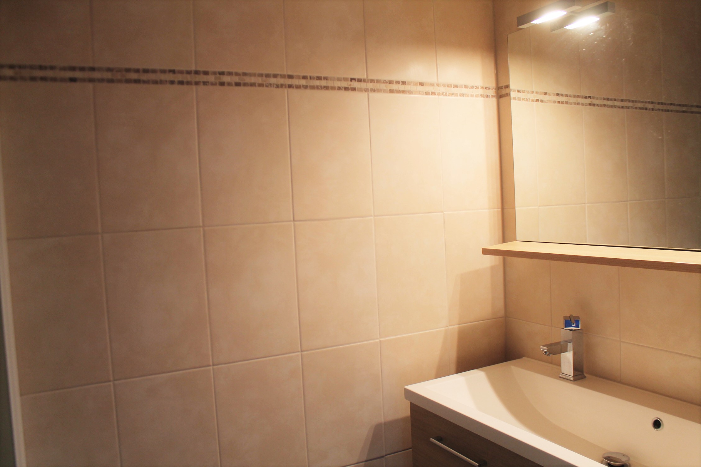 Geheel en modern betegelde badkamer v.v. tegelvloer, inloopdouche met glazen douchedeur en modern badmeubel met wastafel, dubbele kraan en spiegel met inbouwverlichting.