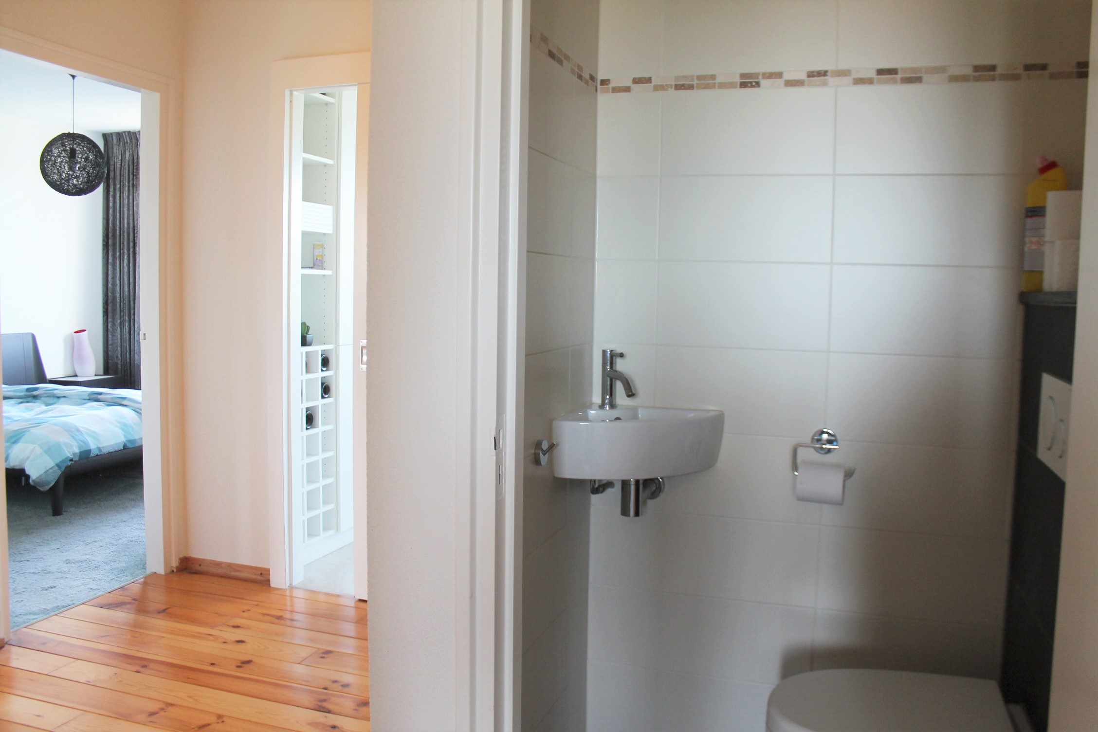 Royale entree. Modern en geheel betegeld toilet met fonteintje. L-vormige woonkamer (eetgedeelte 3.50 x 6.05 + zitgedeelte 4.05 x 2.10 totaal circa 30 m2) met veel lichtinval en schitterend uitzicht over het centrum. Gesloten keuken (circa 9,5 m2) v.v. moderne aanbouwkeuken met apparatuur (vaatwasser, koelkast, ruime vriezer, inductiekookplaat, RVS afzuigkap). De keuken is voorzien van een ruime op maat gemaakte kast met veel bergruimte. Bergkast/ wasruimte (0.87 x 1.35) met wasmachineaansluiting en geiser. 2 Slaapkamers beiden v.v. vloerbedekking.
