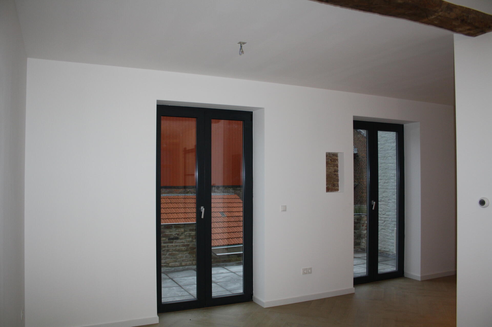 Ontvangsthal (1.53 x 2.23). Gastentoilet met fonteintje. L-vormige woonkamer (9.30 x 3.38 / 2.54 x 3.60) met gesloten haard en zicht over de Basiliek. Halfopen keuken (3.71 x 3.00) voorzien van moderne aanbouwkeuken met apparatuur (vaatwasser, inductie kookplaat, afzuigkap, combi-oven, koelkast, vriezer). Vanuit de woonkamer en keuken is het dakterras bereikbaar.