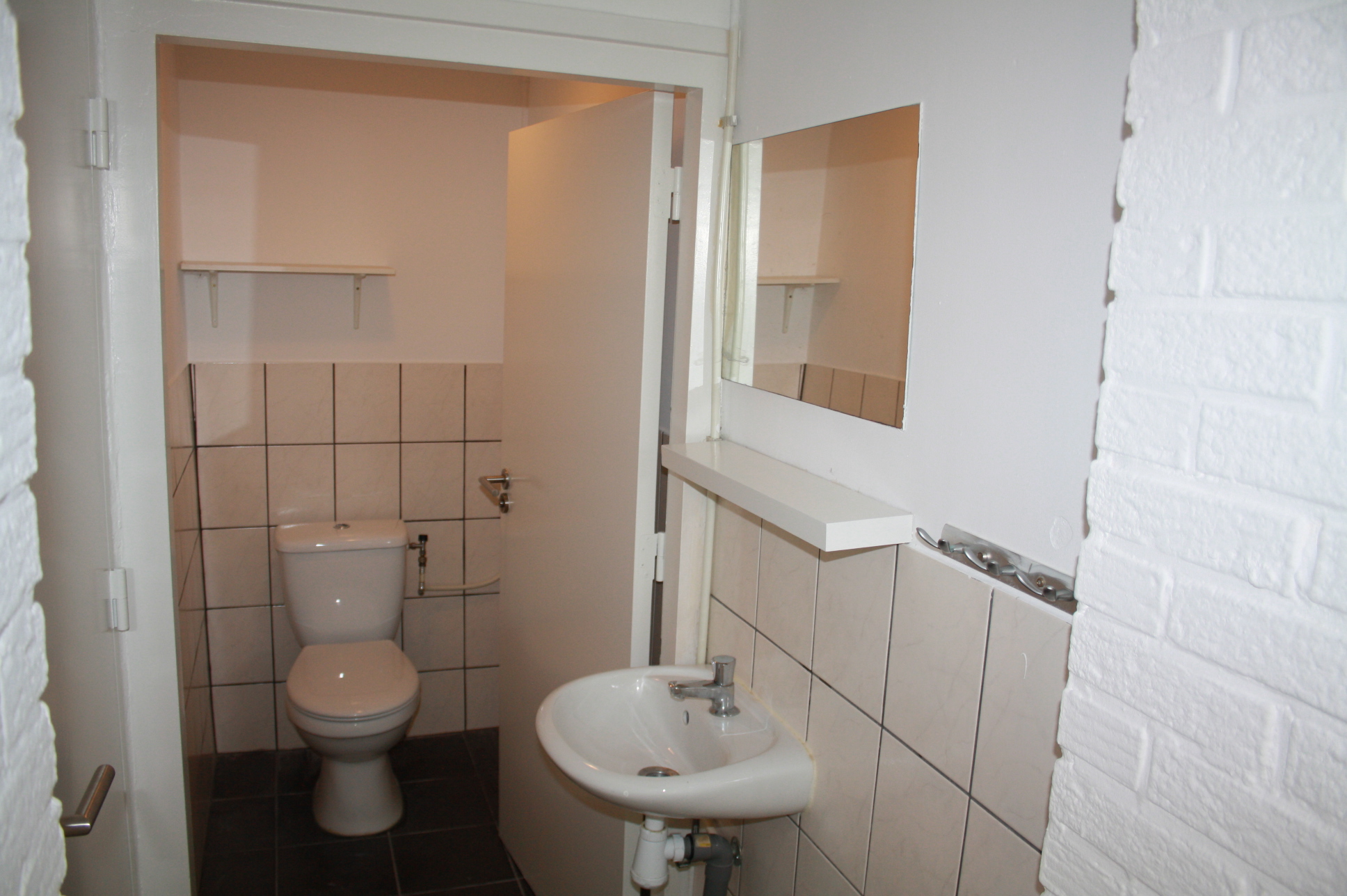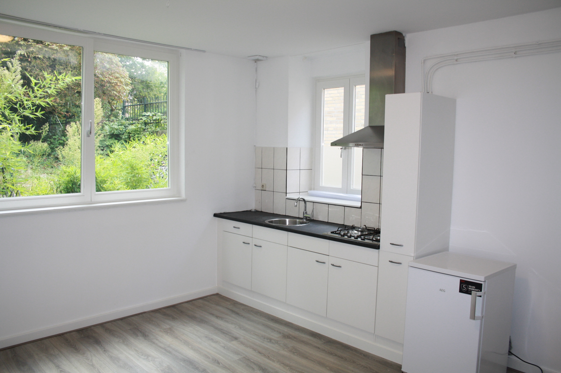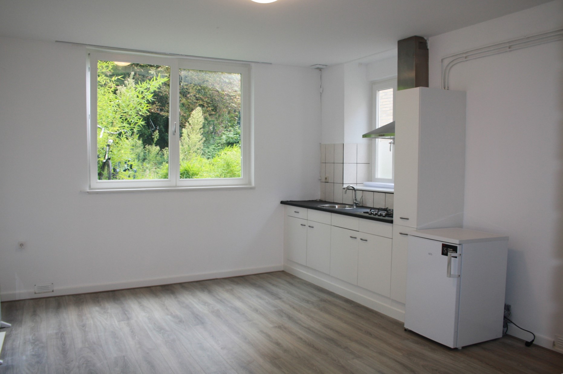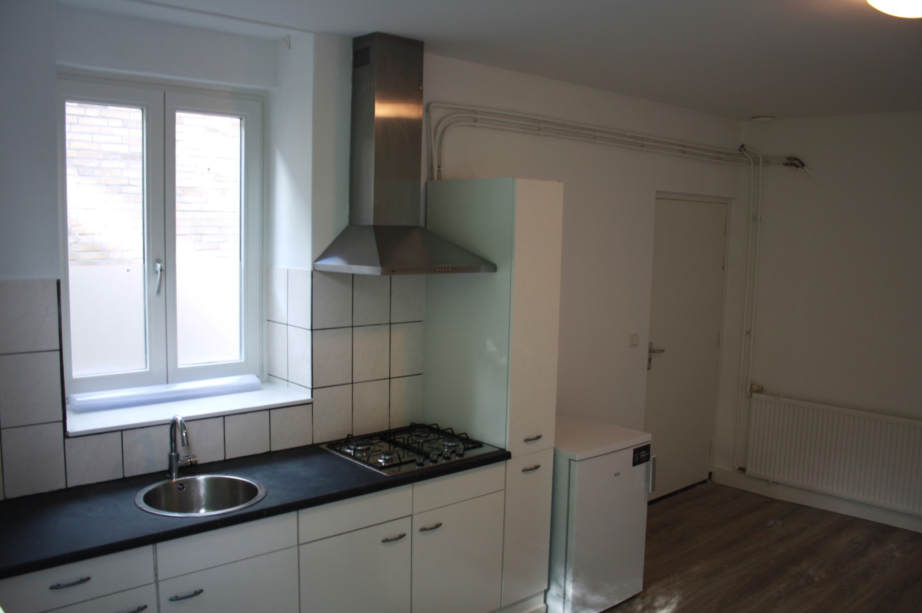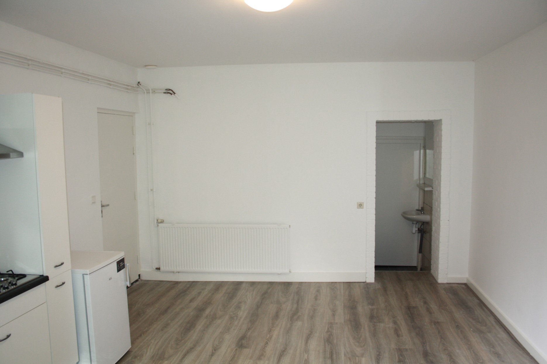 Eigen voordeur. Woon-slaapkamer (5.00 x 4.00) met laminaatvloer, veel lichtinval en open keuken. Keuken is voorzien van een modern keuken blok met apparatuur (4-pits gaskookplaat en afzuigkap losse koelkast). Geheel betegelde badkamer (1.40 x 1.06) met tegelvloer en douche. Apart toilet met voorportaal en wastafel.
