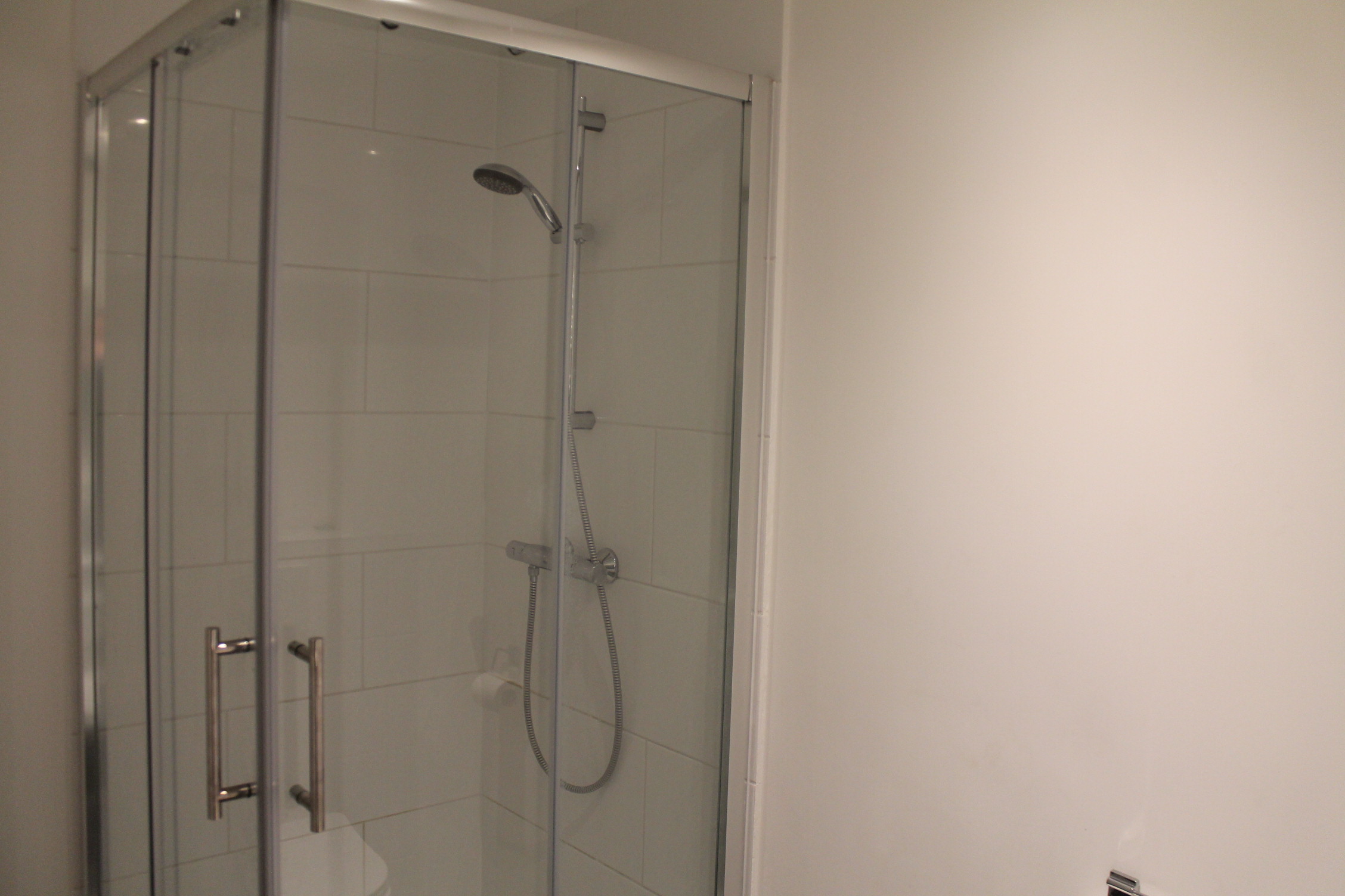 Modern betegelde badkamer (2.65 x 1.81) met tegelvoer, douche, toilet en wastafel.