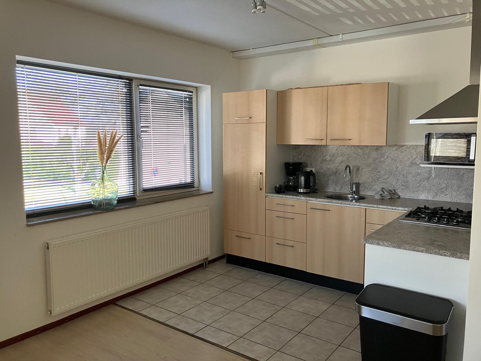 Ruime hal (18m2), berging (4m2) met opstelplaats voor CV-combi installatie en WTW-unit. Tevens bevinden zich hier witgoedaansluitingen. Ruime woonkamer met open keuken (37m2). De keuken is voorzien van een gaskookplaat, vaatwasser, afzuigkap en koelkast. Badkamer (8m2) is voorzien van ligbad, instapdouche en vaste wastafel. Aparte toiletruimte met wandcloset en fonteintje.