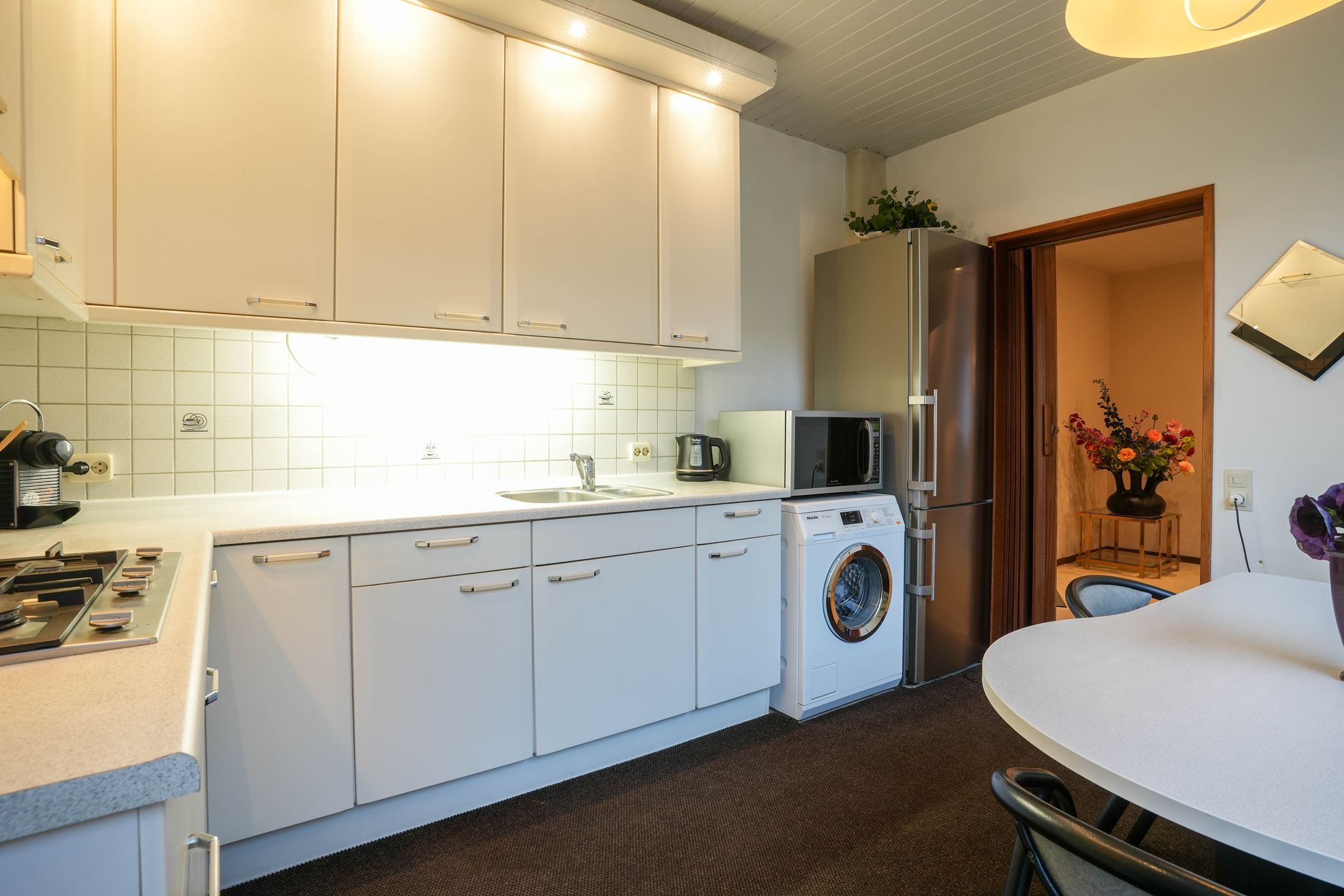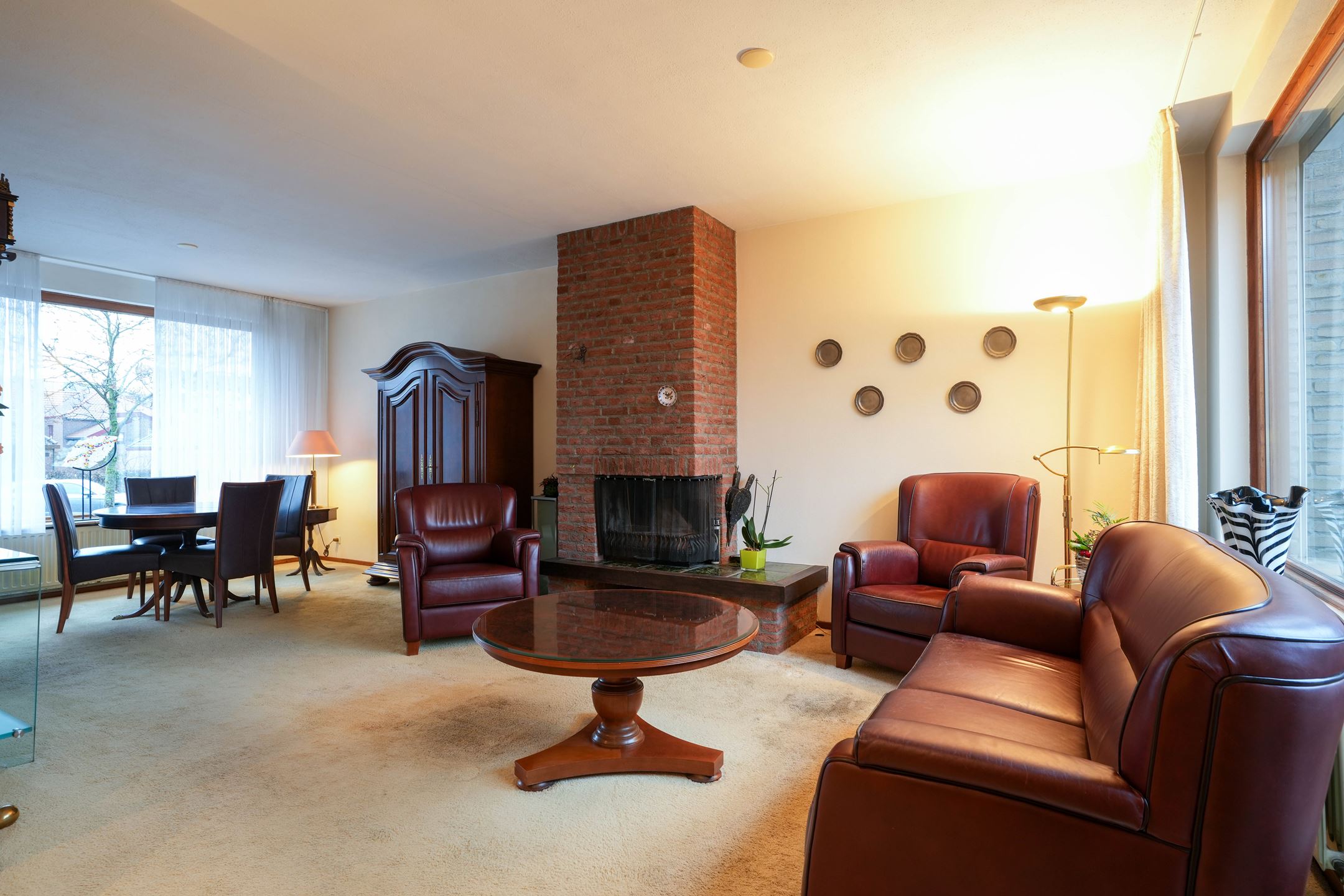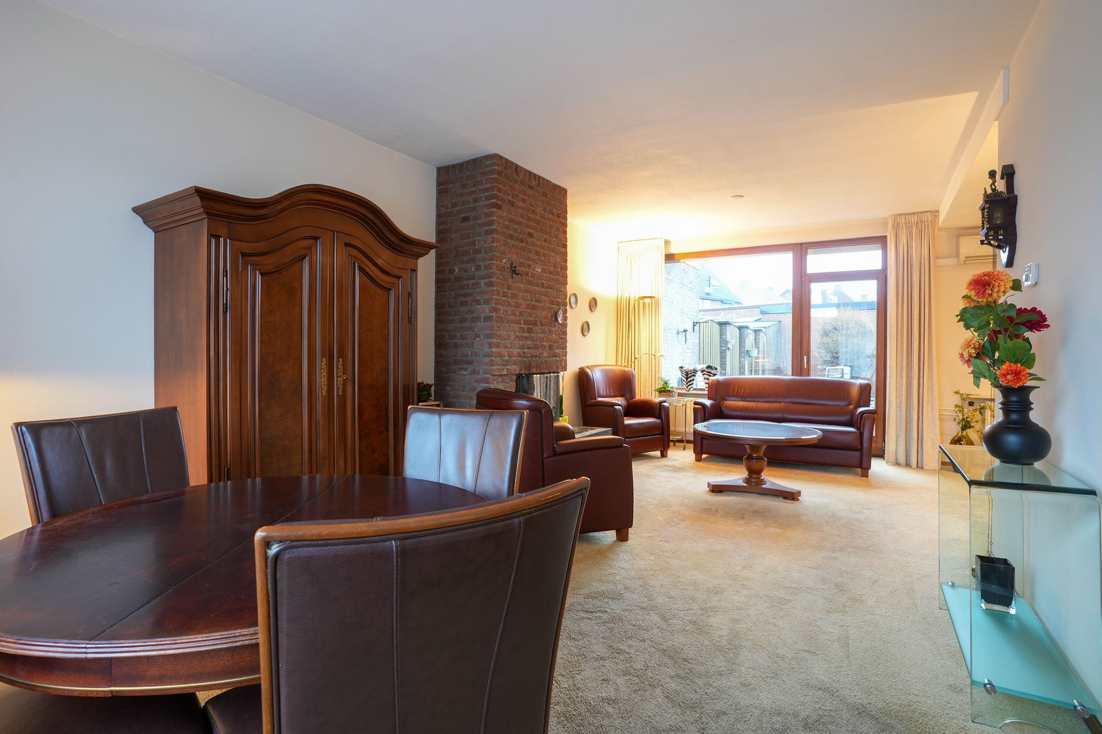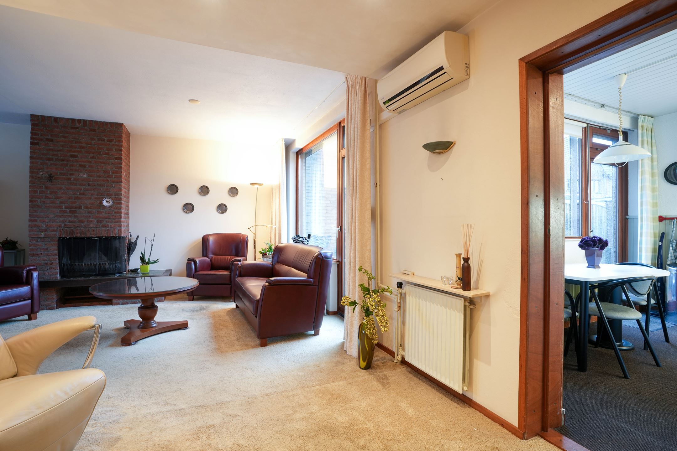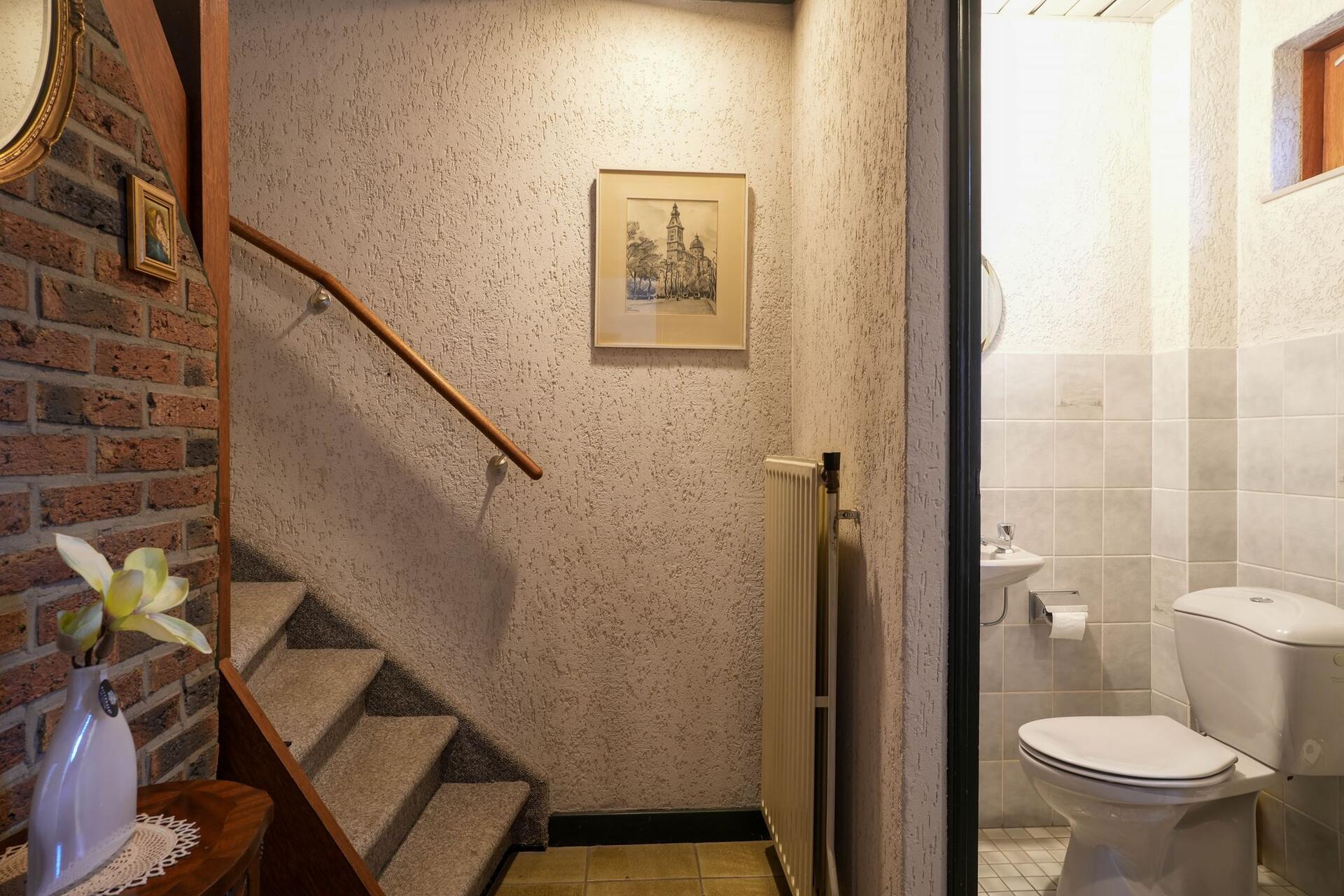Hal/entree met garderobehoek. Gastentoilet met fonteintje. L-vormige woonkamer (7.60 x 6.65/3.65) voorzien van open haard, deur naar tuin, veel lichtinval en airco. Halfopen keuken (3.70 2.70) voorzien van nette aanbouwkeuken met apparatuur (4 pits gaskookplaat, vaatwasser en afzuigkap). In de woonkamer wordt een nieuwe laminaatvloer gelegd.