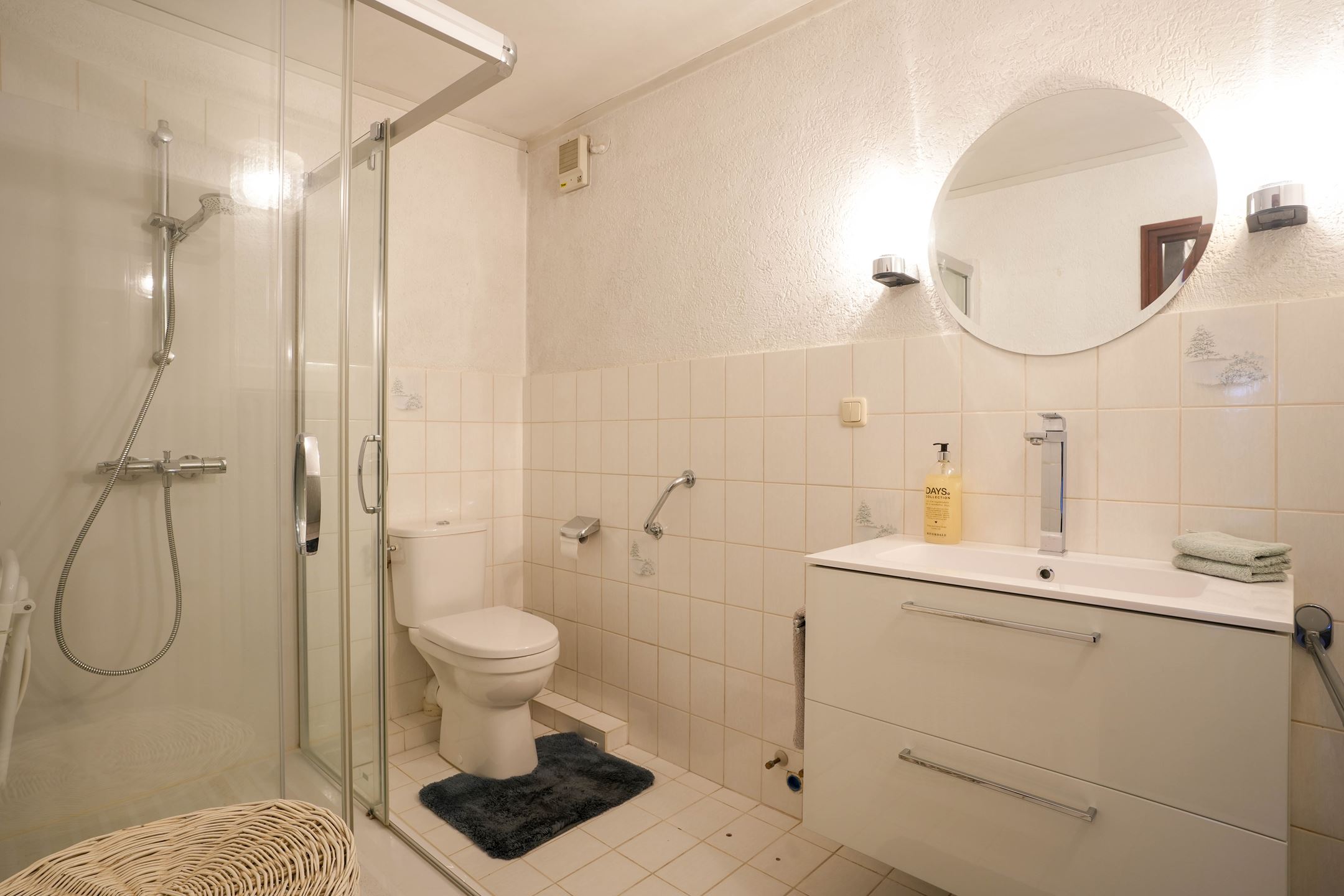 Deels betegelde badkamer (2.91 x 1.86) met inloopdouche, 2e toilet en baadmeubel met wastafel.
