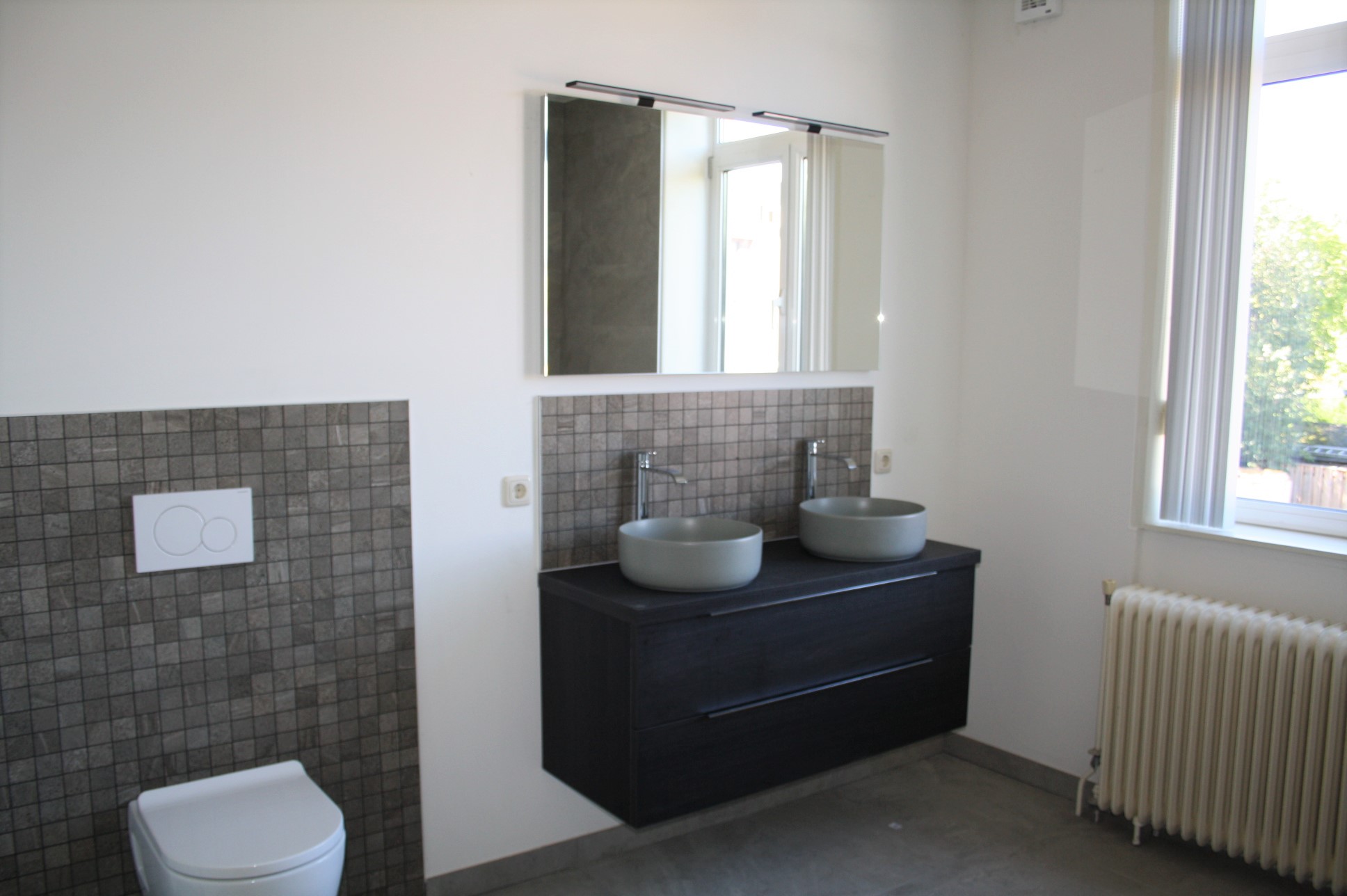 Moderne en geheel vernieuwde badkamer (3.35 x 3.00) met douche, douchecabine, badmeubel met dubbele wastafel en 2e toilet.